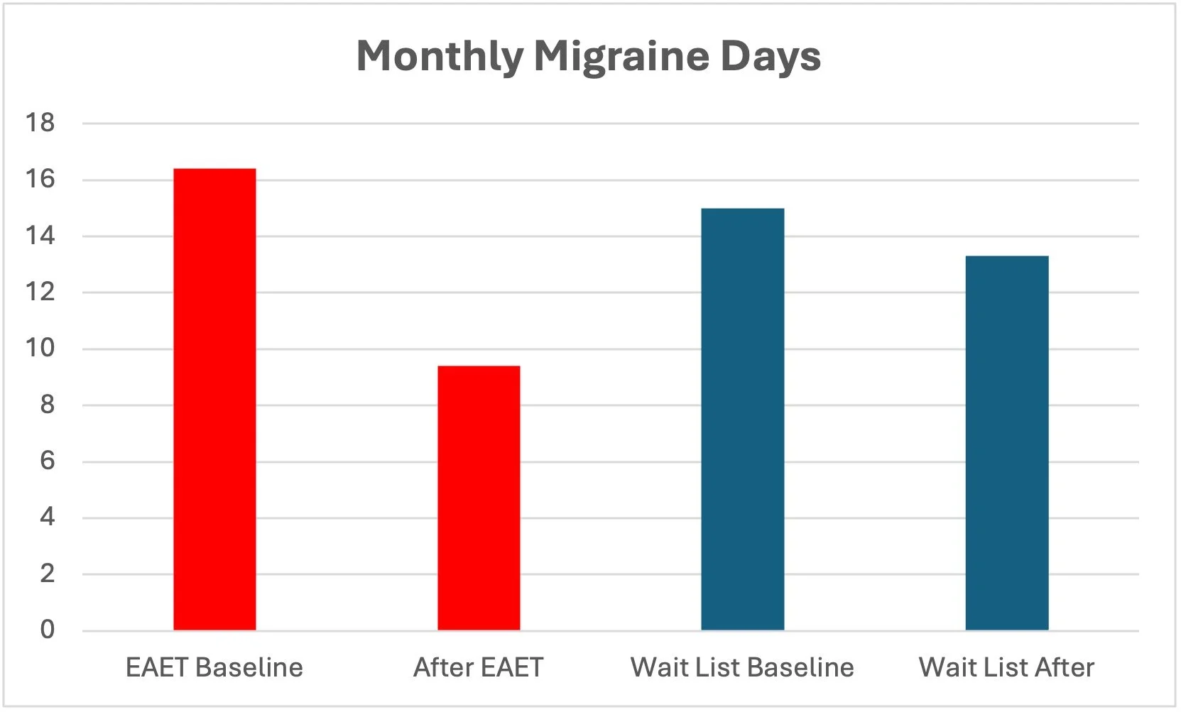 EAET had a significant, large effect on monthly migraine days (MMD), which reduced by 7.0 days (43%) from baseline compared to a 1.7 day reduction (11%) among Wait List Controls (p=.006). Pooled data from all 24 participants who received EAET (15 in the EAET arm and 9 WLCs), found that EAET had a large effect size on MMD (P<.001, d=−0.86). See the bar graph below.
