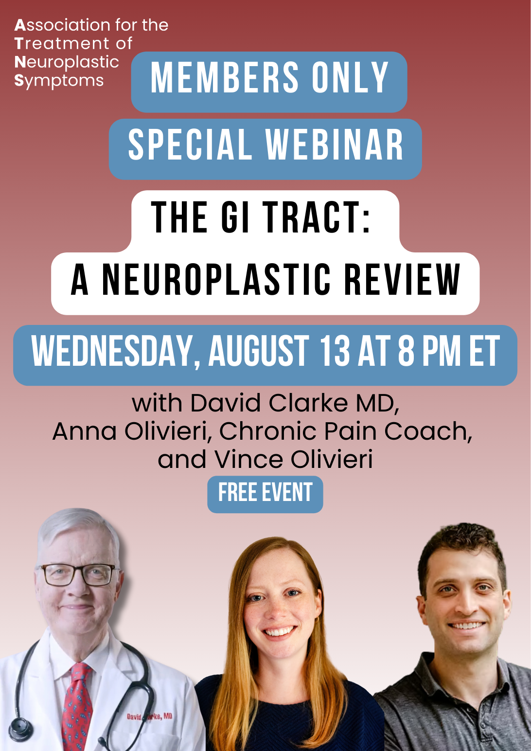 As an ATNS Member, you gain access to a growing number of evidence-based resources (live events, courses, and much more) that relieve neuroplastic pain or illness. Your support will also help us educate more people about this life-changing new treatment.